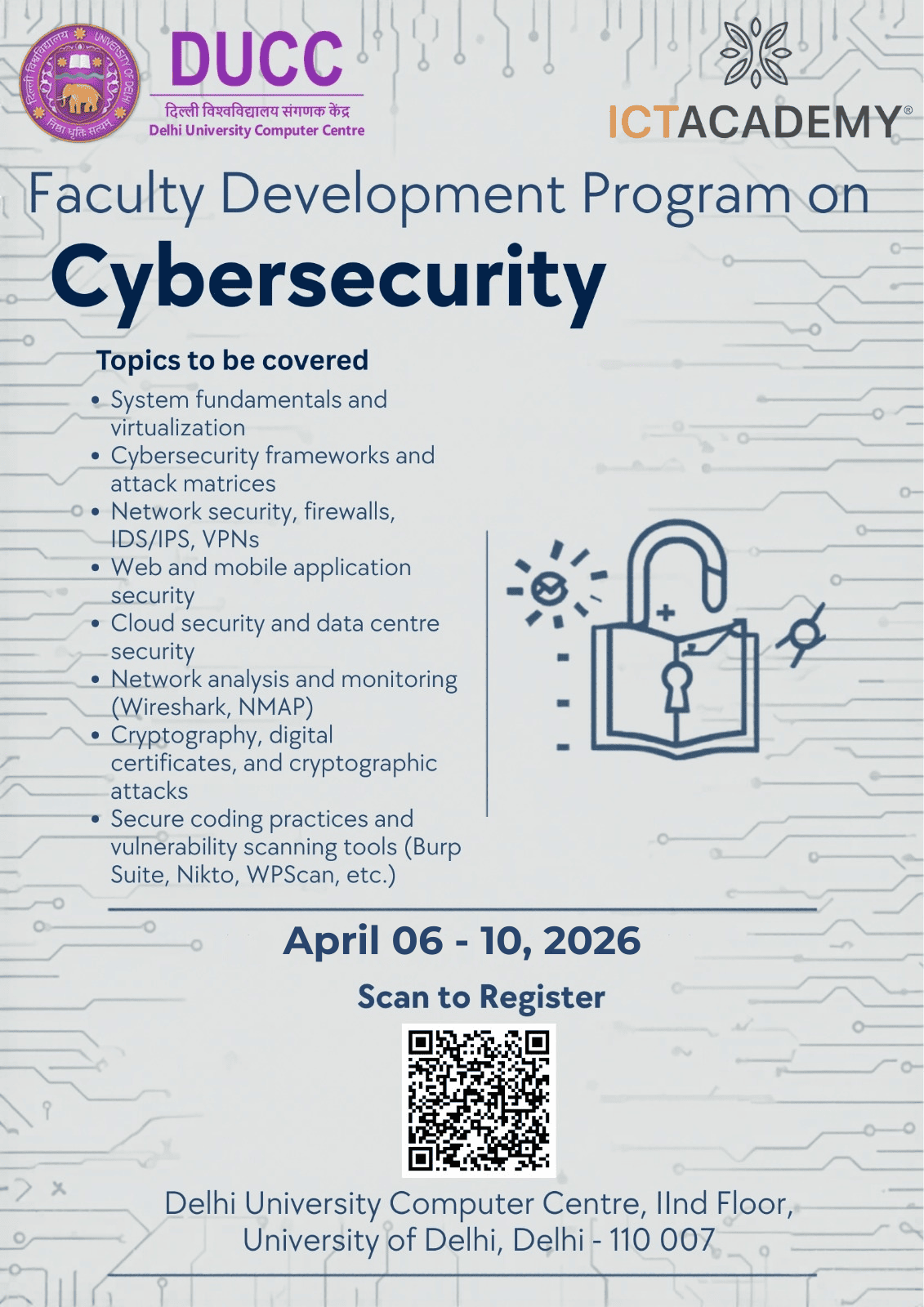 The FDP aims to provide comprehensive exposure to contemporary cybersecurity concepts through lectures, demonstrations, and hands-on sessions. The programme will broadly cover:
